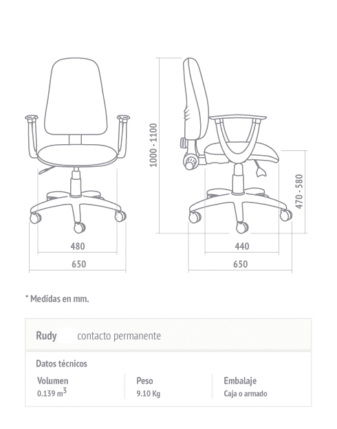 Sillón de oficina modelo Rudy.Respaldo y asiento tapizado en ecocuero negro.Respaldo regulable. CON apoyabrazos.Sistema neumático. Peso máximo que soporta: 130 kg. Dametro Estrella 59cm. Nacional.